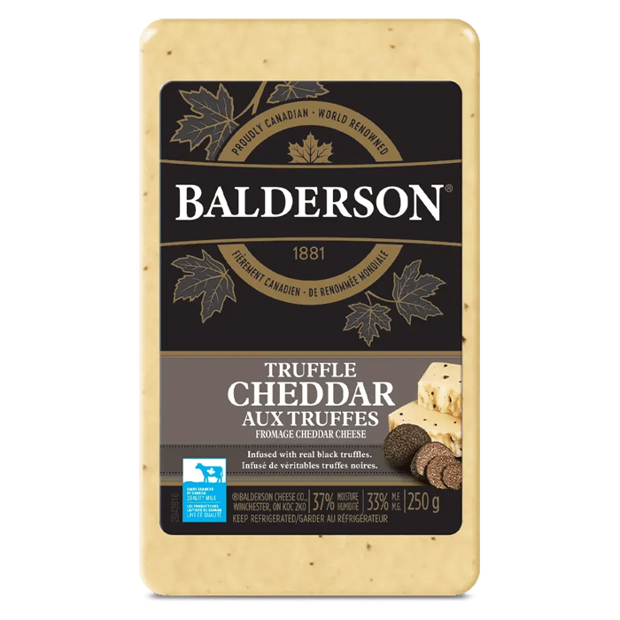 Un vrai régal pour les sens! Notre fromage cheddar aux truffes Balderson est un cheddar savoureux, infusé de véritables morceaux de truffes et d’un arôme audacieux auquel vous ne pourrez pas résister.